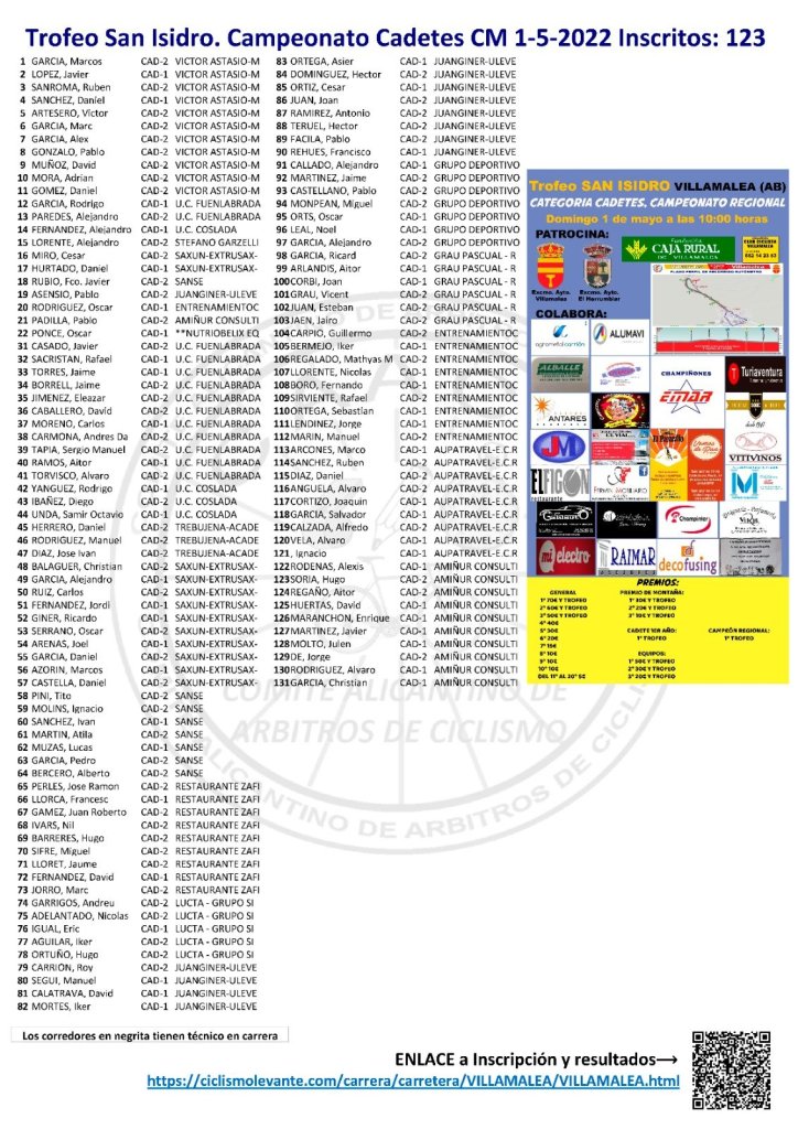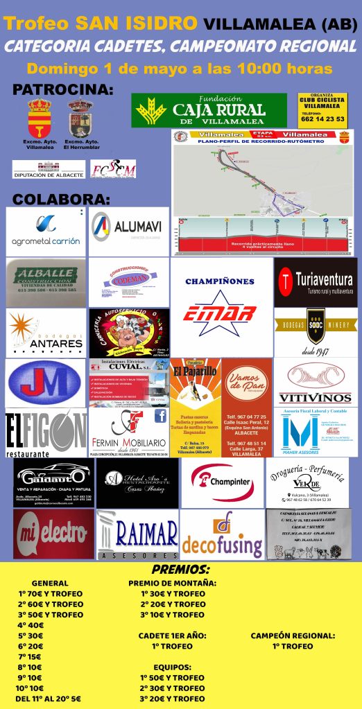 Villamalea (Albacete) acogerá el próximo domingo 1 de mayo, a partir de las 10 horas, el Trofeo San Isidro, marco del Campeonato cadete de Castilla-La Mancha en carretera. Con salida y meta en la localidad de Villamalea, la carrera propone un circuito de 13 kilómetros, prácticamente llano, al que los ciclistas darán cuatro vueltas hasta sumar un total de 52 kilómetros. La prueba incluye un Premio de Montaña situado en una subida de un kilómetro en la localidad de El Herrumblar. La llegada a meta contará con una dificultad añadida: una recta final de 300 metros picando hacia arriba.