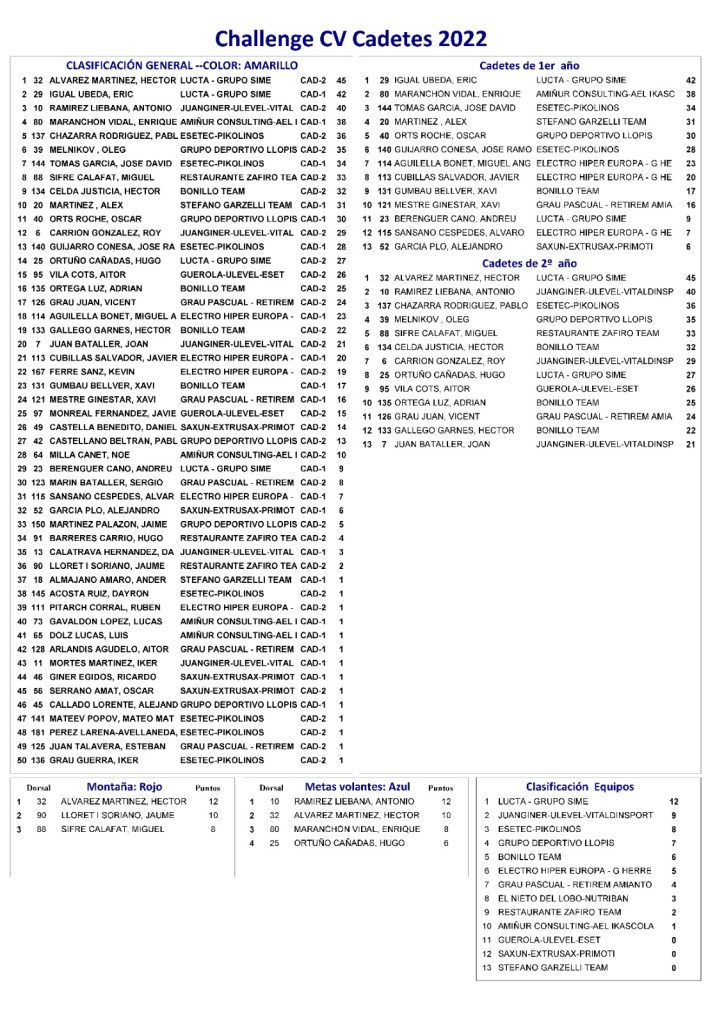 Tras la disputa de esta prueba, Héctor Álvarez es el líder de la Challenge de Jocs Escolars de Cadetes y también cuenta con el maillot rojo de primer escalador y es el mejor cadete de segundo año. El de cadete de primer año es para Eric Igual, el de las metas volantes lo lleva Ramírez y el mejor equipo es el Lucta-Grupo Sime.