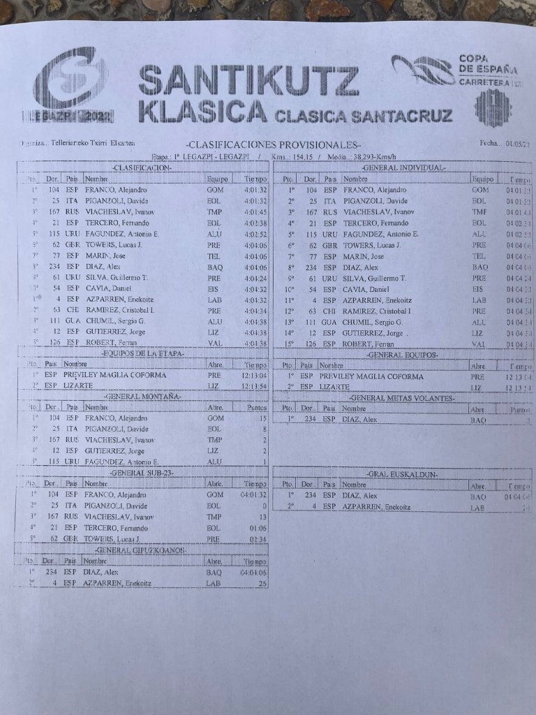 Las rampas finales de Aztiria fueron testigo de las buenas piernas de Piganzoli y del empeño y coraje de Franco, con el del Gomur soltándose en primera instancia y volviendo a enlazar en los metros finales del alto. De ahí al final ambos manejaron bien su renta para jugarse la victoria en un apretadísimo sprint que caída del lado de Franco, que daba así la segunda victoria consecutiva a su equipo en esta Copa de España.