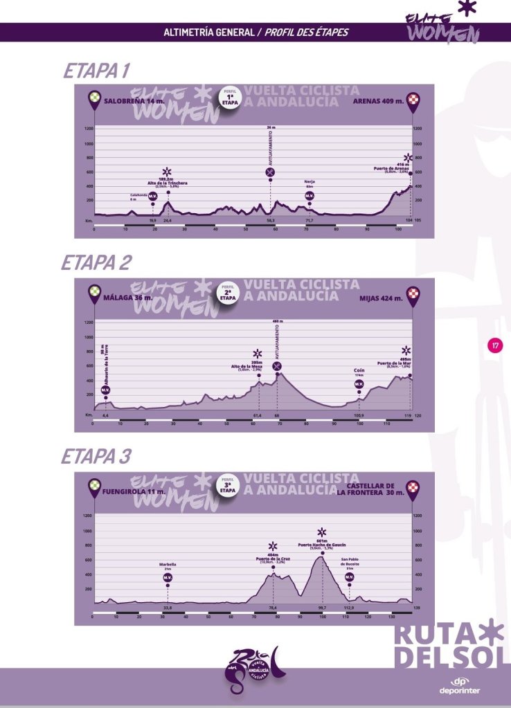 La primera edición de la Ruta del Sol Vuelta Ciclista a Andalucía Elite Woman se celebrará entre los días 3 y 5 de mayo. Destacar la presencia en el pelotón de la alicantina Cristina Barrajón, que competirá con el maillot del Sopela.