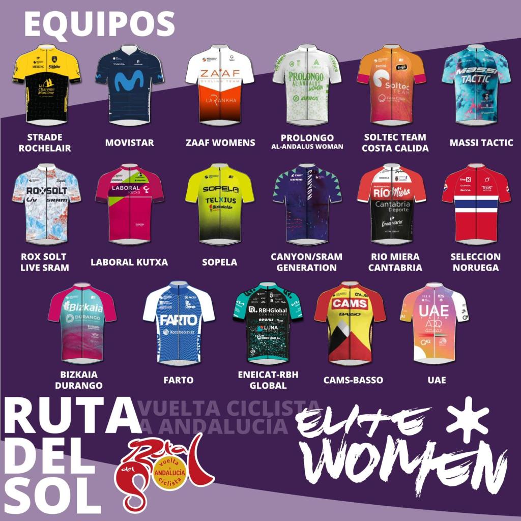 Serán diecisiete los equipos que tomarán parte en la prueba con dos escuadras UCI Pro Movistar y UAE; trececontinentales (Strade Rochelair (FRA), Soltec Team Costa Cálida (ESP), Massi Tactic (ESP), Rox Solt Live Sram (AUS), Laboral Kutxa (ESP), Sopela (ESP), Canyon Sram Generation (GER), Rio Miera Cantabria (ESP), Selección Noruega (NOR), Bizkaia Durango (ESP), Farto (ESP), Eneicat-RBH Global (ESP), CAMS BASSO (GBR) y dos equipos categoría nacional, el equipo andaluz Prolongo Al-Andalus Woman y el Zaaf Womens (ESP).