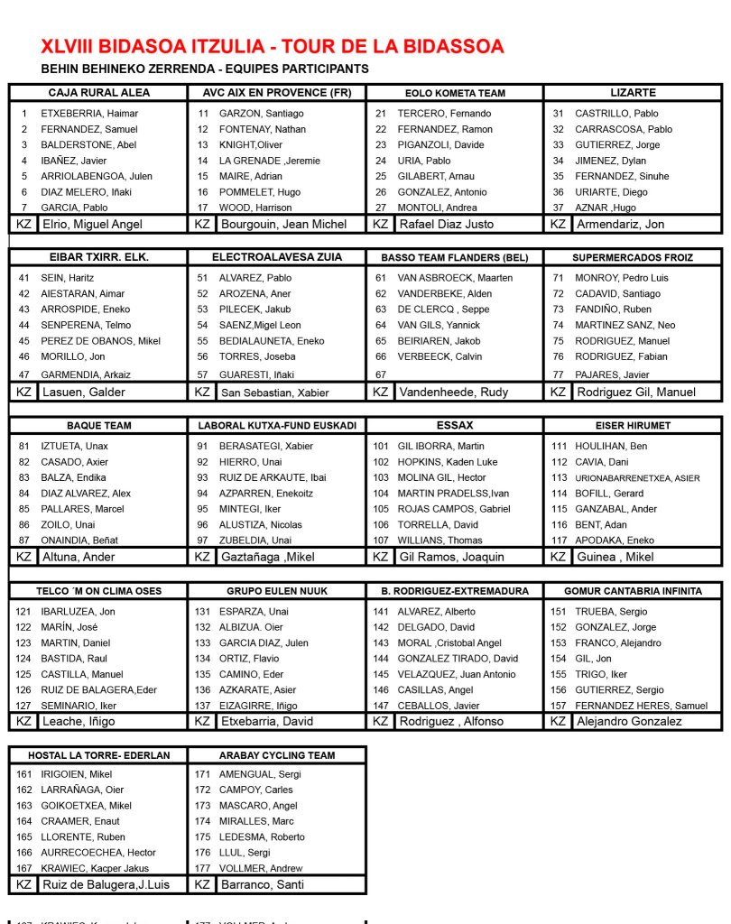 La 48 edición de la Bidasoa Itzulia, para corredores sub 23, que se disputará de 5 al 7 de mayo en tres etapas, contará con la presencia del Equipo Essax. Los sajeños tienen inscritos a Martín Gil, Kaden Hopkins, Ferney Molina, Gabriel Rojas, José Sanz, David Torrella y Thomas Williams.