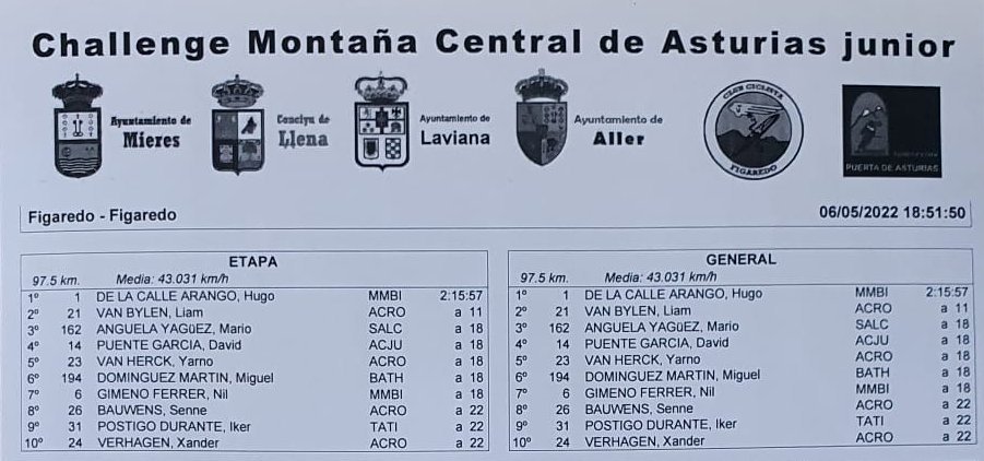 Hugo de la Calle (MMR) ha ganado la primera etapa de la Challenge Montaña Central Asturias Júnior que ha tenido salida y meta en Figaredo. Su tiempo ha sido de 2:15.57. Lian Van Bylen ha entrado a 11 segundos y Mario Anguela, a 18.
