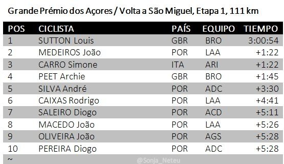 Louis Sutton (Brocar Alé) ha sido el ganador de la primera etapa del Gran Premio de las Azores / Volta a São Miguel disputada entre Ponta Delgada y Nordeste de 111 kilómetros de recorrido. El ciclista británico ha llegado en solitario a la meta, con 1.22 sobre Joao Medeiros, y se ha vestido con el maillot de líder. También se ha hecho en propiedad con el de los puntos y de los jóvenes, mientras que André Silva es el poseedor de el de la montaña.