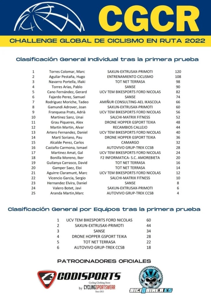 Torres suma 120 puntos, por los 108 de Hugo Aguilar (Entrenamiento Ciclismo) y los 98 de Iñaki Navarro (Tot Net Terrassa). Octava plaza para el también ciclista de la escuadra sajeña Joan Gamundi (60 puntos). Por escuadras, el UCV Team Bikesports va primero, con el Saxun, a continuación. El Drone Hopper de Raúl Mira es cuarto.