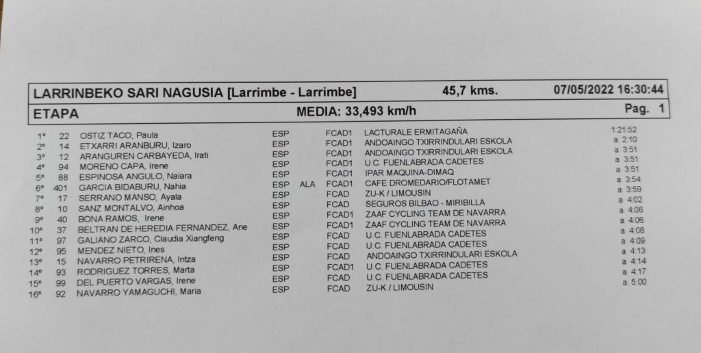 Paula Ostiz (Lacturale Ermitagaña) ha sido la vencedora de la primera etapa de la Vuelta Ciclista a Álava Femenina- III Trofeo Fundación Vital-DFA para cadetes. La prueba se ha disputado en Larrimbe sobre una distancia de 45,7 kilómetros. Izaro Etxarri (Andoaingo) finaliza segunda y su compañera de escuadra Irati Aranguren, tercera. Claudia Xiangfeng (Fuenlambrada) firma una undécima plaza.