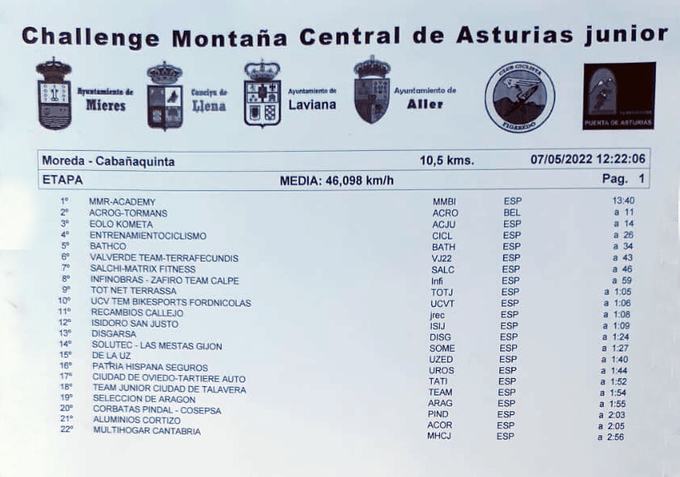Por la mañana el MMR Academy se impuso en la contrarreloj por equipos, disputada entre Moreda y Cabañaquinta de 10,5 kilómetros, parando el reloj en los 13’40’’. A once segundos finalizó el Agrog Tormans y el Fundación Contador, tercero, a 14 segundos. El Infinobras hecho octavo, a 59 segundos del vencedor.