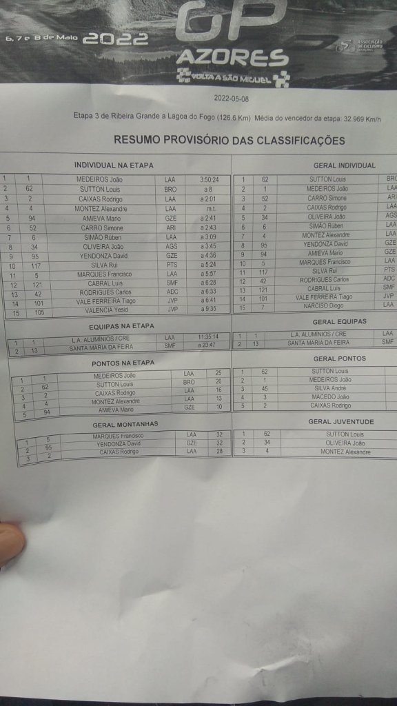 Louis Sutton (Brocar Alé) se ha coronado esta tarde en el Lagoa do Fogo, final de la tercera etapa, en el ganador del GP Azores/Volta a São Miguel. El pelotón partió de Ribeira Grande y llegó a la meta, tras 127 kilómetros de recorrido, con Joao Medeiros como vencedor y el británico de la Fundación Benicadell en segundo lugar a 8 segundos. Gran trabajo de la escuadra alcoyana para proteger una túnica que conquistó el británico en la primera jornada. También se ha llevado el maillot de primer joven y el de los puntos.