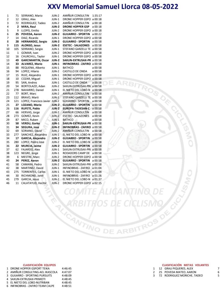 Mario Serrano (Amiñur) se ha impuesto en Dénia en el XXV Memorial Samuel Llorca para corredores júniors. Su tiempo ha sido 1:35.17. A 18 segundos han entrado cuatro corredores encabezados por Alex Grau (Drone Hopper), Tadeo Rodríguez (Amiñur), Raúl Mira (Droner) y Emilio Llopis (Drone Hopper). A 22 ha atravesado la línea de meta Aarón Poveda (Guijarro), que tuvo una avería, mientras que Ricardo Díaz (Droner) ha dado el tiempo al pelotón, a 58. Sergio Hernández (Guijarro) ha terminado octavo y Jesús Alonso (Esetec), noveno. El Drone Hopper ha sido el mejor equipo y Álex Grau se ha llevado las metas volantes.