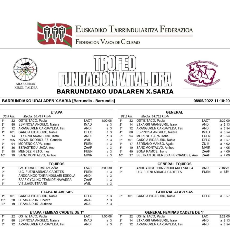 Paula Ortiz (Lacturale Ermitagaña) volvió a ganar en la Vuelta a Álava Femenina-Trofeo Fundación Vital-DFA y se impuso el domingo en la segunda etapa disputada en Barrundia. Naiara Espinosa (IPAR) fue segunda y Irati Aranguren (Andoaingo), tercera. Puesto 15 para Claudia Xiangfeng (Fuenlabrada). En la general, Paula Ortiz ha sido la ganadora, por delante de Izaro Etxarri (Andoaingo) y de Irate Aranguren. La alicantina Claudia Xiangfeng ha rozado el top 10 con un undécimo puesto. Además, su equipo, el Fuenlabrada, ha sido segundo, por detrás del Andoaingo. Una buena prueba de fuego para Claudia en su idea de seguir creciendo como ciclista. Carreras como la que ha disfrutado este fin de semana en tierras vascas, con ese nivel, le permiten adquirir una experiencia y demostrar que su trabajo está en el buen camino, aunque la corredora del Fuenlabrada es consciente de que todo pasa seguir entrenando duro para poder estar en lo alto.