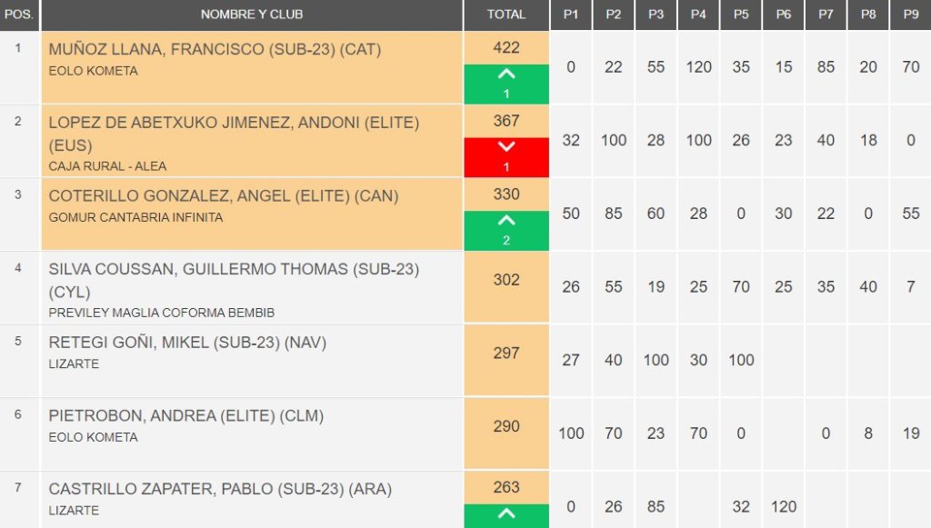 Francisco Muñoz (Eolo Kometa) lidera la general de la Copa de España Élite-Sub23 a falta de la prueba final en Vigo, que se celebrará este próximo domingo. Andoni López de Abetxuko (Filial Caja Rural) es segundo, a 55 puntos y Ángel Coterillo (Gomur), tercero, a 92.