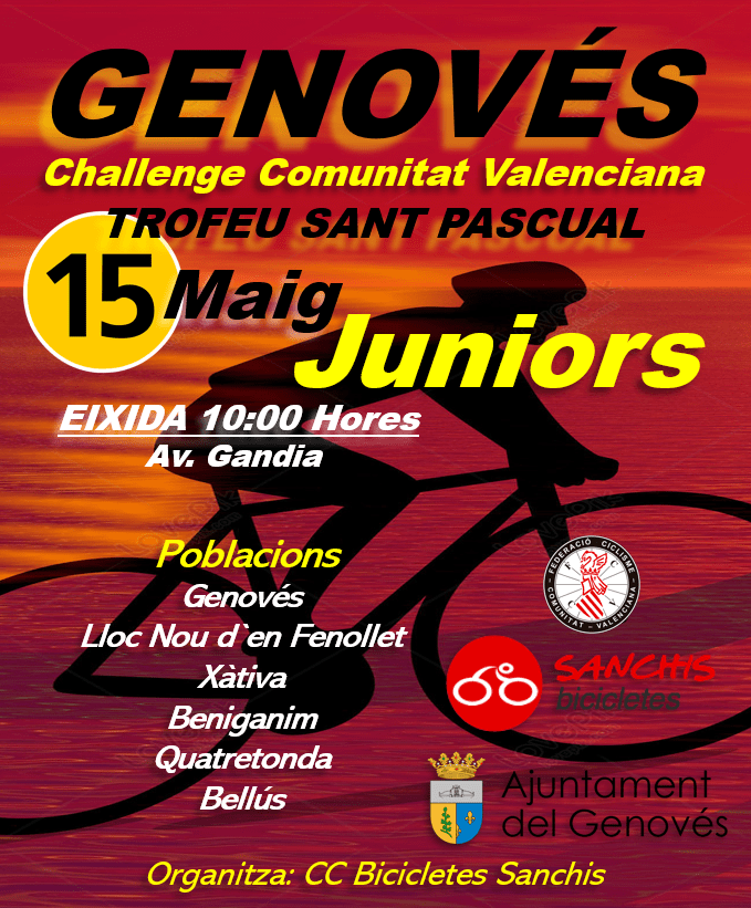 El domingo, día 15 de mayo, se disputa en Genovés, el Trofeu Sant Pascual para corredores júniors que dará comienzo a las 10 horas y que organiza el CC Bicicletes Sanchis. Contará con 94,20 kilómetros de recorrido y es la primera prueba de la Challenge de la Comunitat Valenciana juvenil. Estarán los equipos alicantinos Saxun Extrusax Primoti, Guijarro Sporting Pursuits y el Infinobras. También se pondrán el dorsal Raúl Mira (Drone) y Jesús Alonso (Esetec).