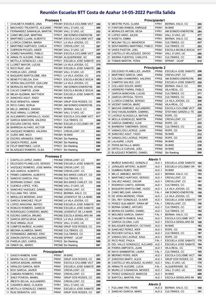 I Open BTT CV Costa Azahar-Escuelas de Ciclismo. Inscritos