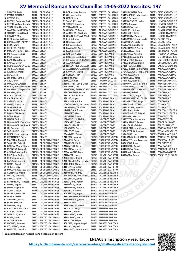En lista de equipos que participarán en ambas carreras están los locales Brocar Alé y Essax, que tratarán de ser profetas en su tierra. Los alcoyanos pondrán en liza a Louis Sutton, que viene de ganar el GP Azores, y a Javier Chacón, vencedor el pasado fin de semana de la Challenge Costa Cálida-Región de Murcia. Junto a ellos estarán Richard Vi, Pol Hervás, Cameron Preece, Archie Peet, Will Beeche, Max Rowley, Matt Watson, Adam Robertson, Unai Cerdá y Thiago. El resto de la plantilla competirá el domingo en Vigo en la Copa de España Élite y Sub23.
