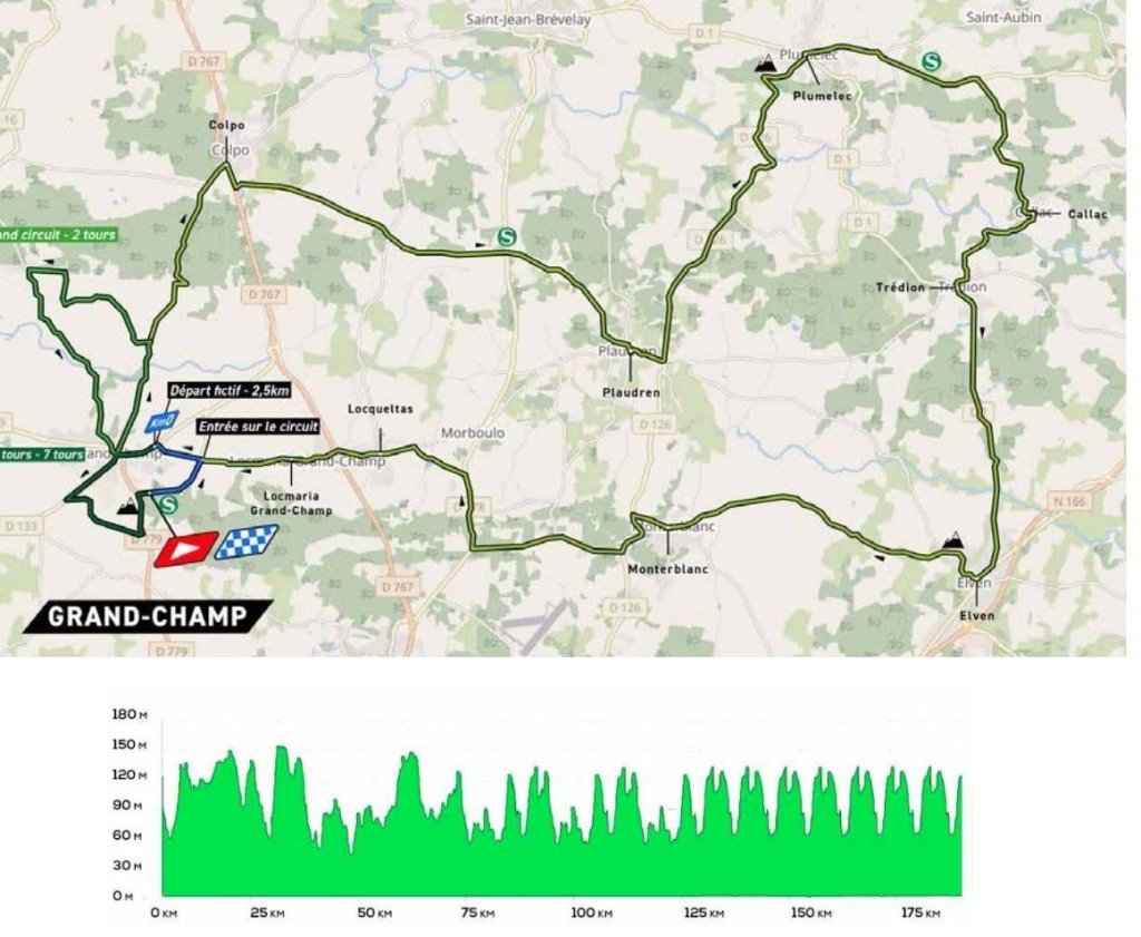 Los 185 kilómetros del GP Morbihan se dividen en tres circuitos. El primero, una larga vuelta por Plumelec con dos pasos de montaña y terreno ideal para una fuga. A partir de ahí, dos vueltas a un circuito de 20 kilómetros con sendos pasos por meta y siete vueltas a un pequeño circuito local por Grand-Champ de 8’3 kilómetros. Terreno que obliga a una buena colocación y aunque no es excesivamente duro, propone varios giros que tensarán el pelotón.