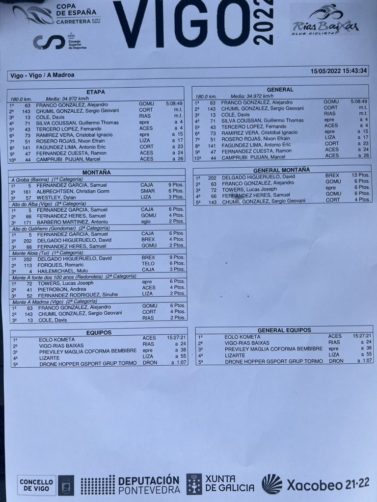 Chumil (Aluminios Cortizo), Tercero (Eolo-Kometa), Franco (Gomur) y Silva (Priviley) han sido algunos de los ciclistas protagonistas de esos movimientos y quienes se estaban mostrando como los más fuertes. Un parón ya dentro del kilómetro final ha propiciado la entrada de Cole Davis (Vigo-Rías Baixas) o Eric Fagúndez (Aluminios Cortizo) que se han metido en el sprint por la victoria. El triunfo, gracias a una potentísima arrancada, ha sido finalmente para Alejandro Franco que ha batido a Chumil y a Davis, que han entrado con el mismo tiempo que él y han completado el podio.