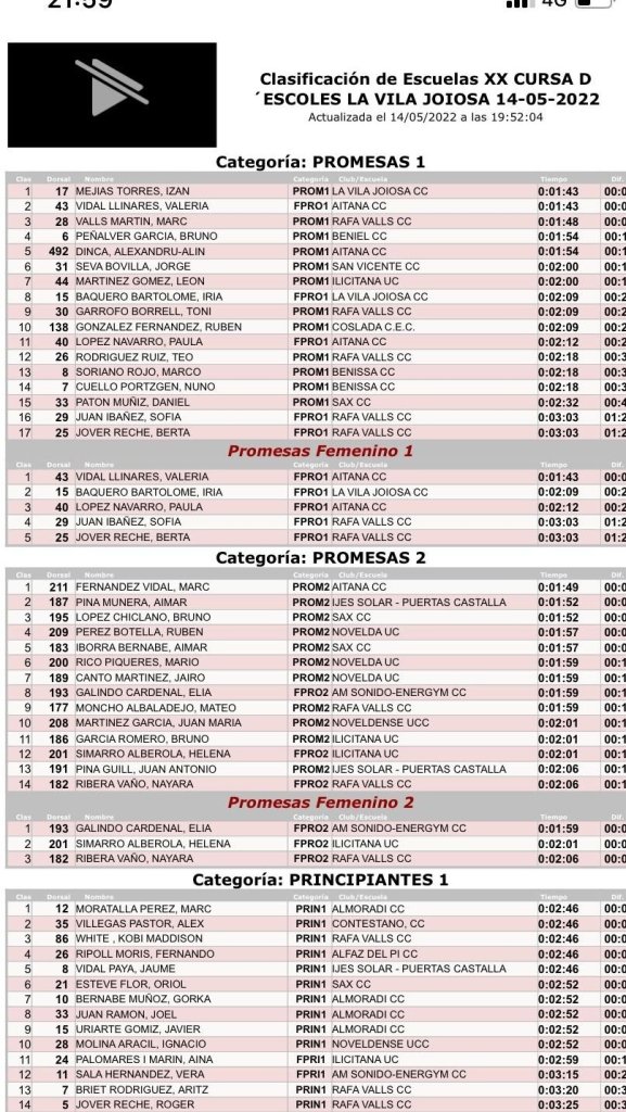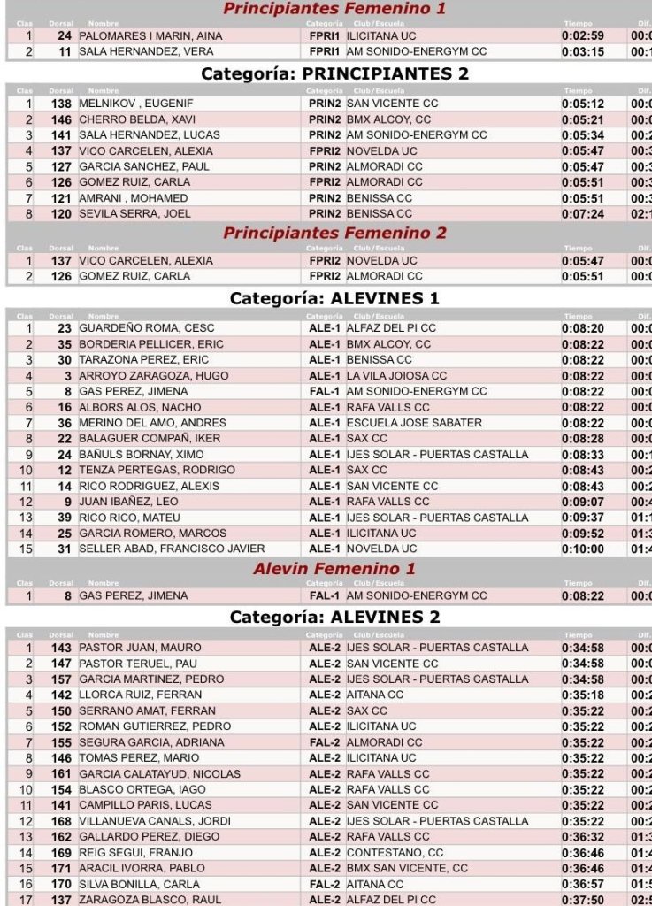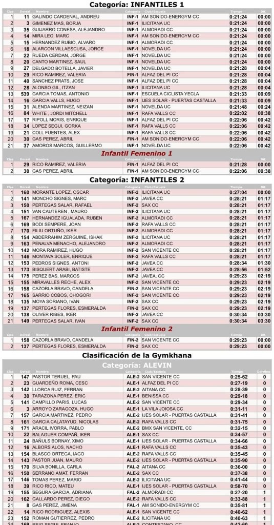 - Benissa. XLIII Prova Provincial d’Escoles de Ciclisme Vila de Benissa – Memorial Alejandro Jaén. Clasificaciones