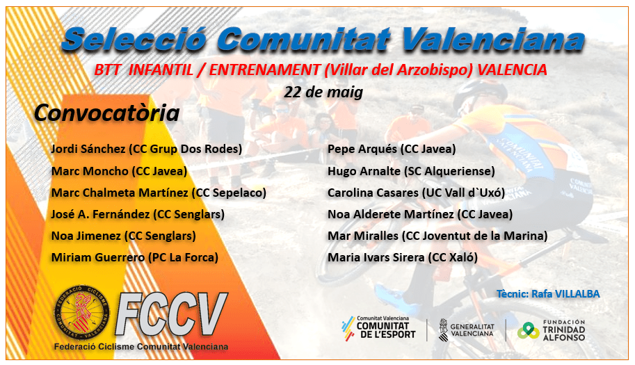 La preselección autonómica infantil de BTT de la Comunitat Valenciana realizará un entrenamiento en Villar del Arzobispo (Valencia) el próximo domingo 22 de mayo. La convocatoria está formada por Jordi Sánchez, Marc Moncho, Marc Chalmeta, José A. Fernández, Noa Jiménez, Miriam Guerrero, Pepe Arqués, Hugo Arnalte, Carolina Casares, Noa Alderete, Mar Miralles y María Ivars.