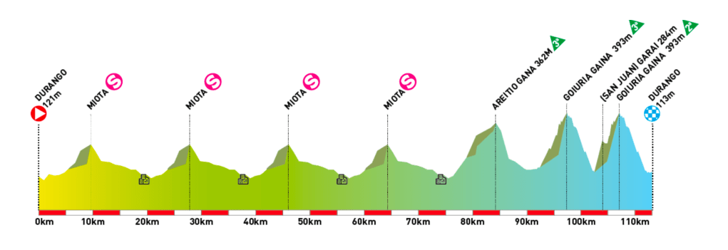 El recorrido de la carrera de Durango, de 113 kilómetro, con inicio y final en la Plaza Ezkurdi de la localidad vizcaína, ha añadido a los pasos por Miota -cuatro, uno menos que en 2021- y al duro par de ascensiones finales a Goiuria (5,5 km al 5%), con el último ascenso precedido por el alto de Garai (rampas de hasta el 18%), la cota de Areitio, antes de las dos decisivas, con 1100m al 6% en tres escalones.