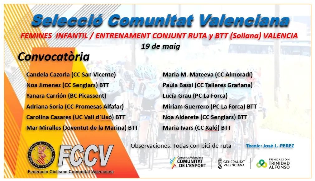 La preselección autonómica infantil de féminas de ruta y BTT realizará un entrenamiento conjunto en Sollana (Valencia) este jueves, 19 de mayo. Las convocadas son Candela Cazorla, Noa Jiménez, Yanara Carrión, Adriana Soria, Carolina Casares, Mar Miralles, Maria M. Mateeva, Paula Bassi, Lucía Grau, Miriam Guerrero, Noa Alderete y María Ivars.