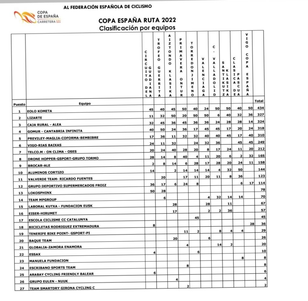 El Brocar Alé ha finalizado la Copa de España Élite y Sub 23 2022, que bajó el telón el pasado domingo en Vigo, en novena posición, lo que le garantiza ser equipo oficial de dicho torneo en la temporada 2023. La escuadra de la Fundación Benicadell cumple de esta manera su objetivo de la cmapaña ya que las diez primeras escuadras son las que tienen billete para integrar cada edición de la Copa. El Eolo Kometa ha sido el mejor equipo, por delante del Lizarte y el Caja Rural Alea de Jaume Guardeño.