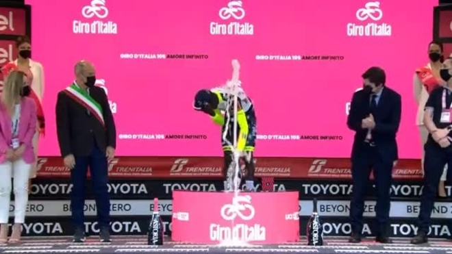 Biniam Girmay (Intermarché-Wanty-Gobert Matériaux), ganador de la etapa de ayer, ha abandonado el Giro de Italia. El corredor eritreo sufrió un accidente durante la celebración del triunfo de ayer, cuando el corcho de la botella de champán golpeó en uno de sus ojos en pleno acto protocolario en el podio oficial. Tuvo que ser ingresado en un hospital y los oportunos exámenes médicos revelaron lesiones en el ojo izquierdo, que requieren la mayor precaución y reposo.