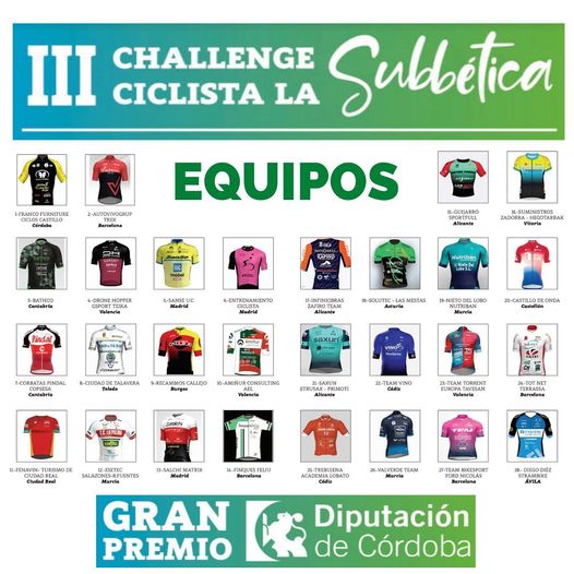 La tercera edición de la Challenge Ciclista de la Subbética, Gran Premio Diputación de Córdoba, se inicia el viernes en Carcabuey y finalizará el domingo en Priego con la participación de 168 ciclistas júniors entre lo que figuran los de los equipos alicantinos Saxun Extrusax Primoti, Guijarro Sporting Pursuits e Infinobras Calpe. Los sajeños compiten con Adam Bortolazzi, Álex Fajardo, Gorka Verdú, Pedro Cámara, Joan Gamundi y Marc Torres. Gabriel Loaiza ejercerá el director. La escuadra de San Vicente lo hará con Aarón Poveda, Razvan Catalin, Aarón Pérez, Miguel Cobo, Carlos Ortega y Sergio Hernández, con Pablo López y José María Gutiérrez como directores. Y el Infinobras contará con Alejandro y Aarón Merenciano, Jordy Richmond, David Martínez, Iker Soriano y Jordi Galváñ. El corredor del Saxun Extrusax Primoti, Marc Torres, defenderá el liderato de la Challenge Global de Ciclismo en Ruta en esta segunda prueba del Torneo paraciclistas júniors que comenzó con la Klasika de Amorebieta. También acude Raúl Mira, con el Drone Hopper Gsport, acompañado de Ricardo Buba, Alex Grau, Marc Mestre, Taylor Churchill y Román Torrella. El Bathco pondrá en liza a los valencianos Estanislao Calabuig, Iban Gutiérrez e Abel Odón, además de a Miguel Domínguez, Isaac Gracia y Miquel Moral.