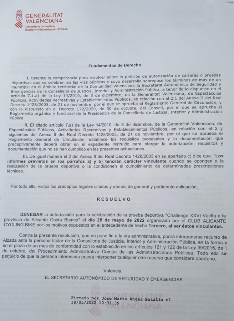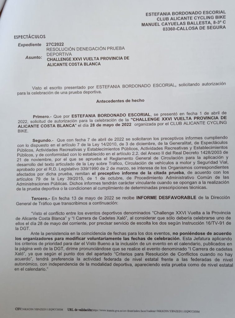 La Dirección General de Tráfico ha denegado la autorización para la celebración de la prueba deportiva “Challenge XXXVI Vuelta a Alicante” del día 28 al coincidir con la «I Carrera de Cadetes de Xalò», que es de nivel estatal. Visto el conflicto entre los eventos deportivos, al considerarse que sólo debería celebrarse uno de ellos el día 28 de mayo y no poniéndose de acuerdo los organizadores para modificar voluntariamente la fechas de celebración, la Jefatura de Tráfico señala en un escrito que «tiene preferencia la actividad federada de nivel estatal frente a las de carácter autonómico», por tanto que la Vuelta a Alicante no puede celebrarse ese día la segunda etapa de la Challenge como en principio estaba previsto entre la Cala de Finestrat y Molins de Orihuela, de 158,4 kilómetros de recorrido. La primera etapa va de San Vicente del Raspeig a Mutxamel, el día 27, y la tercera, de Bigastro a Callosa del Segura, el 29.