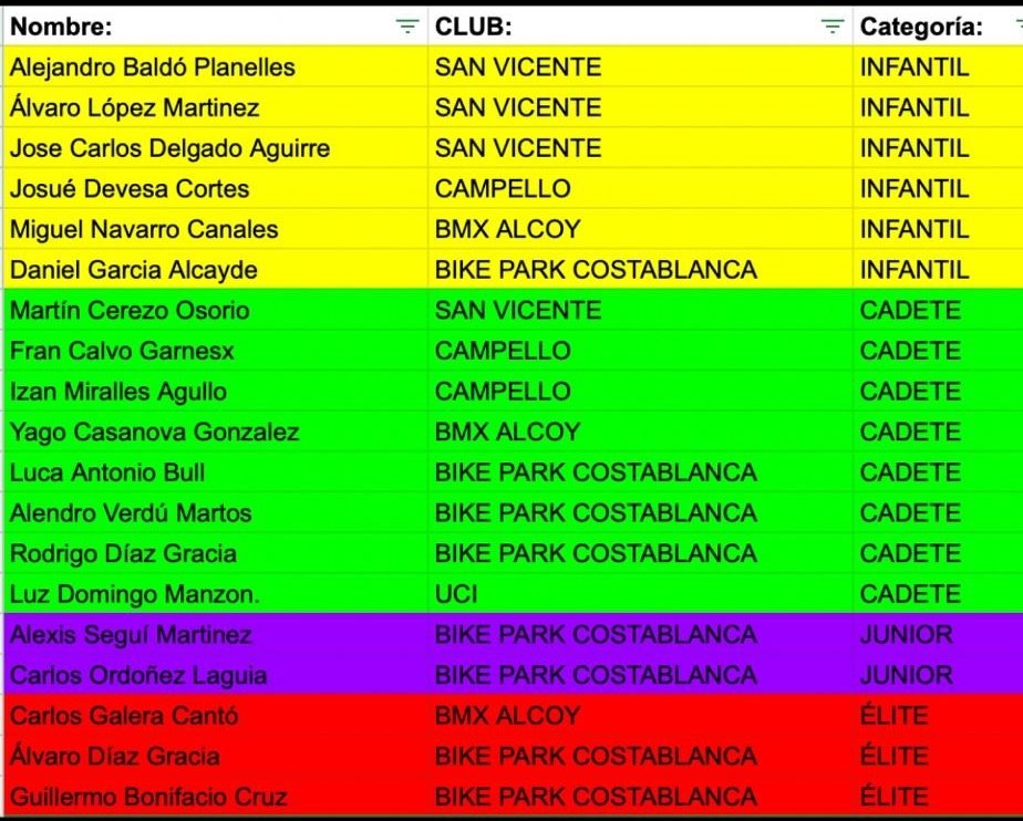 Nico Parres, Alejandro Fuentes y Rosi Fuster trabajarán en esta ocasión con los infantiles Alejandro Baldó, Álvaro López, José Carlos Delgado, Josué Devesa, Miguel Navarro y Daniel García; los cadetes Martín Cerezo, Fran Calvo, Izan Miralles, Yago Casanova, Luca Antonio Bull, Alejandro Verdú, Luz Domingo y Rodrigo Díaz; los júniors Alexis Seguí y Carlos Ordóñez; y los élites Carlos Galera, Álvaro Díaz y Guillermo Bonifacio. Se ha hecho la primera criba con relación a los que se ejercitaron el miércoles en el circuito BMX de San Vicente. Apuntar que tanto en el Autonómico de Elche, que se celebra el sábado, como en las dos jornadas de la Copa de España de Alcoy, previstas para los días 28 y 29, servirán para ver en competición a los distintos integrantes del grupo antes de hacer la selección definitiva.