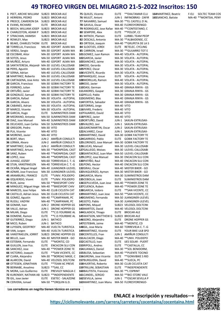 - Categorías: Sub23 Fem., Sub23, Master 60 Fem., Master 60, Master 50 Fem., Master 50, Master 40 Fem., Master 40, Master 30 Fem., Master 30, Junior Fem., Junior, Elite Fem., Elite