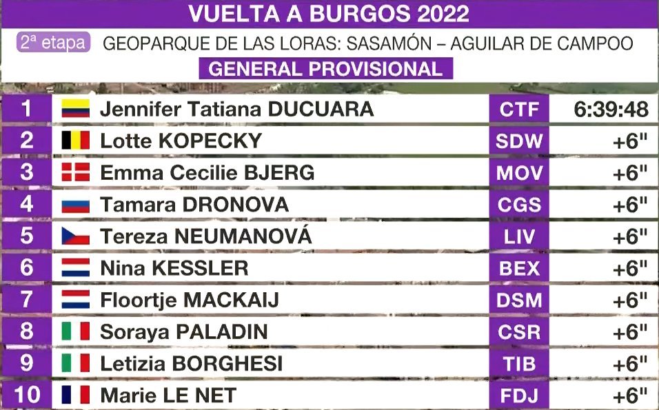 Matilde Vitillo (Bepink), desde la escapada, se ha impuesto en la segunda etapa de la Vuelta a Burgos que ha llevado al pelotón de Sasamón a Aguilar de Campo, tras 129 kilómetros de recorrido. Nina Buijsman (Human) ha sido segunda y Lara Vieceli (Ceratiz), tercera. La colombiana Jennifer Tatiana Ducuara se ha vestido de líder.