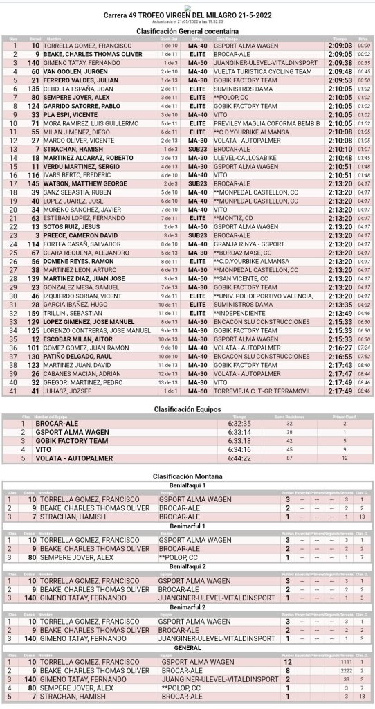 Francisco Torrella (Gsport) se ha impuesto hoy en el 49 Trofeo Virgen del Milagro disputado hoy en Cocentaina. Su tiempo ha sido de dos horas, nueve minutos y tres segundos. A continuación ha entrado Charlie Beake (Brocar), mientras que Fernando Gimeno (JuanGiner) ha completado el podio. Beake ha sido el mejor élite; Hamish Strachan (Brocar Alé), se ha impuesto en sub 23); Julián Ferrero (Gobik) ha ganado en M30; Francisco Torrella, en M40; Fernando Gimeno, en M50; y Jozsef Juhasz (Torrevieja), en M60.