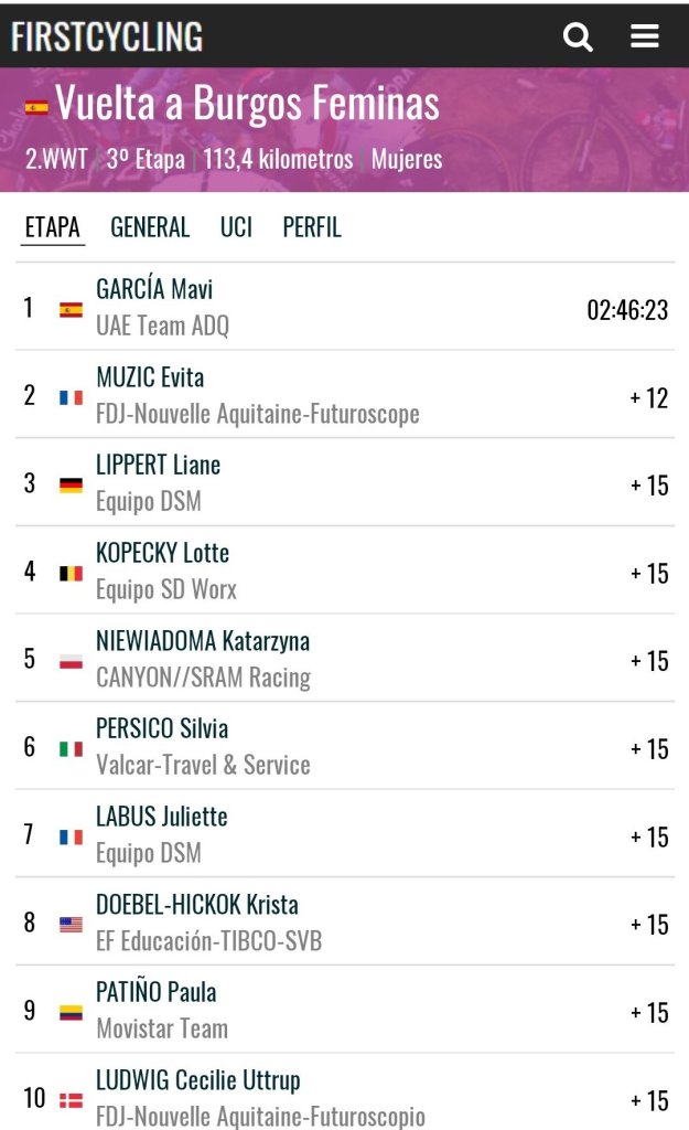 Mavi García (UAE Team ADQ) ganó este sábado en Ojo Guareña la 3ª etapa de la Vuelta a Burgos. En la escapada se impone a Évita Muzic (FDJ Nouvelle-Aquitaine Futuroscope) y se viste de líder a falta de la etapa final del domingo.