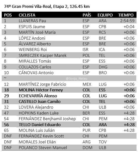 Pau Llaneras (Arabay Cycling Friendly Baleares) gana la segunda y última etapa del 74 GP Vila-real de Ciclismo. Tomás Miralles (Essax) ha sido octavo. Carlos Collazos (Drone Hopper Gsport) se adjudica la ronda castellonense. Jaume Espuis (Controlpack) y Pau Llaneras (Arabay Cycling Friendly Baleares) le ganaron el pulso al pelotón y se jugaron el triunfo de la jornada en las calles de Vila-Real.