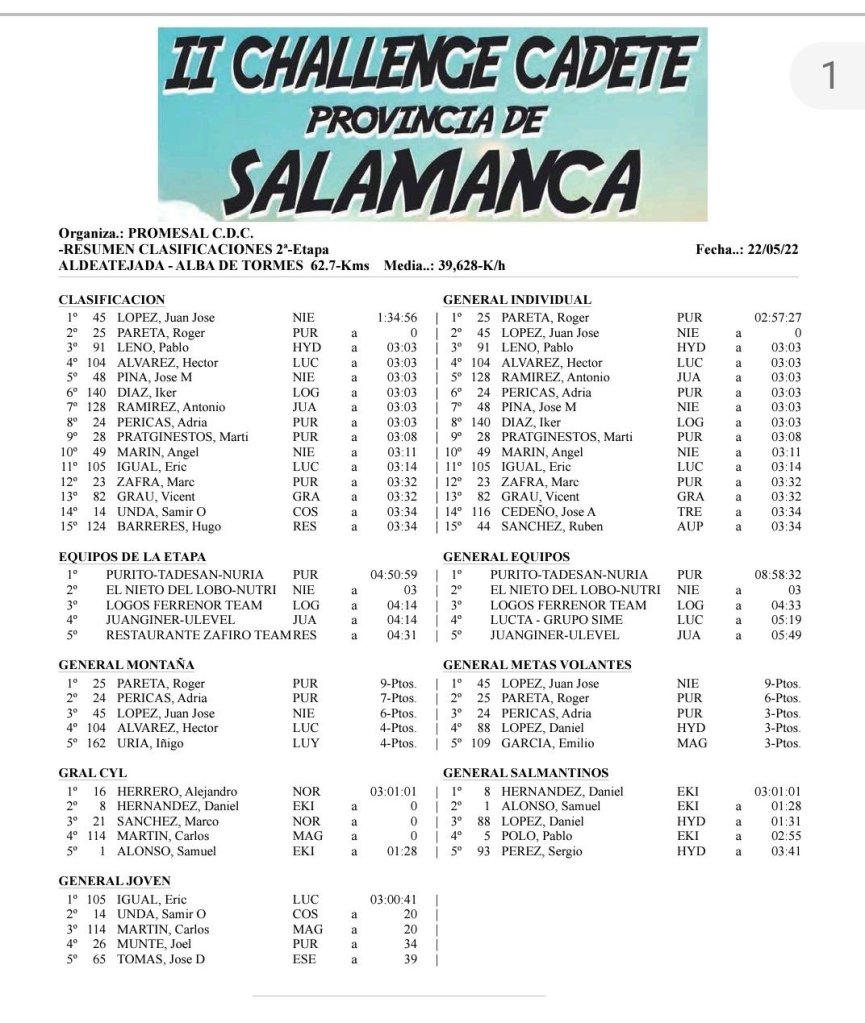 Juan José López (El Nieto del Lobo) ha sido el ganador de la segunda y última etapa de la II Challenge Cadete Provincia de Salamanca que se ha disputado hoy entre Aldeatejada y Alba de Tormes y que ha contado con 62,7 kilómetros de recorrido. López entró en la línea de meta acompañado de Roger Pareta (Purito), que se ha adjudicado la general de la carrera salmantina. A tres minutos y tres segundos accedió bajo la pancarta final el grueso del pelotón encabezado por Pablo Leno (HYDPinturas). Cuarta plaza para el corredor del Lucta Grupo Sime Héctor Álvarez. En el podio de la general, Pareta ha estado acompañado por Juan José López y Pablo Leno. Héctor Álvarez ha finalizado cuarto, con el mismo tiempo que el tercer clasificado. Su compañero de escuadra Eric Igual ha sido el mejor cadete de primer año. Pareta se ha llevado también la montaña y Juan José López las metas volantes. Por escuadra, la mejor ha sido El Nieto del Lobo. Labor de aprendizaje para el Esetec Pikolinos y Zafiro Team por tierras charras.