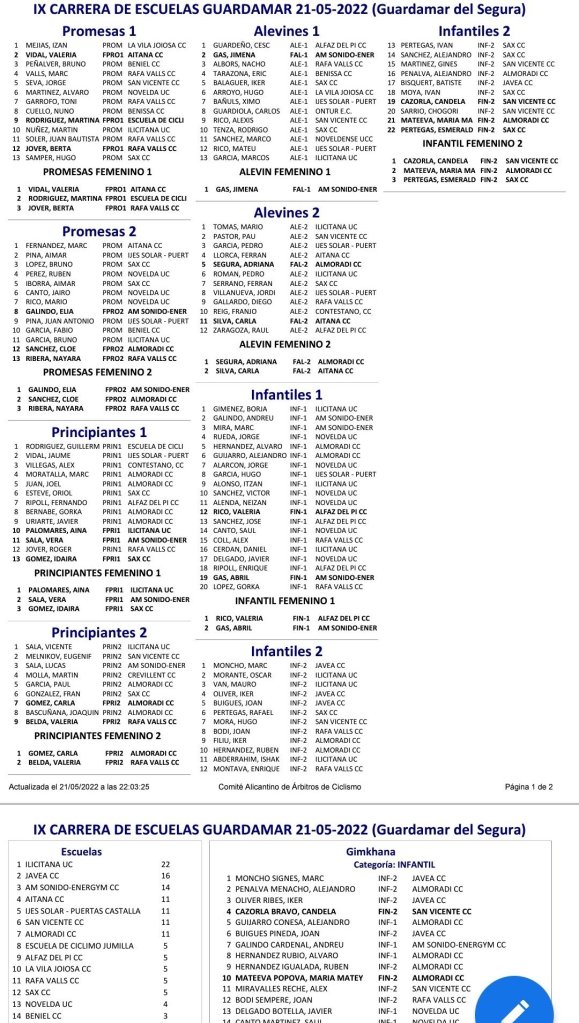 - Benissa. XLIII Prova Provincial d’Escoles de Ciclisme Vila de Benissa – Memorial Alejandro Jaén. Clasificaciones