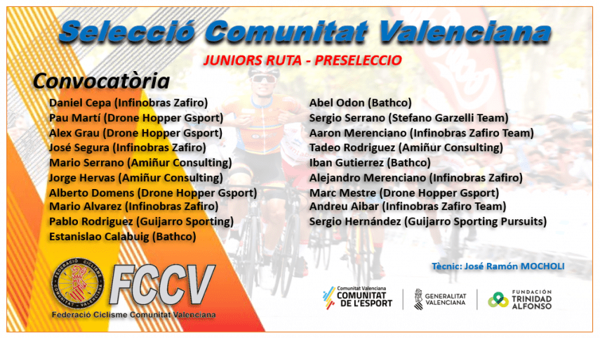 La Preselección está formada por los corredores alicantinos del Infinobras Daniel Cepa, José Segura, Andreu Aibar y Mario Álvarez (Infinobras), además de Sergio Hernández y Pablo Rodríguez, del Guijarro Pursuits. También estan en la lista Alejandro y Aarón Merenciano, de la escuadra alteana, y la completan Pau Martí, Àlex Grau, Mario Serrano, Jorge Hervás, Alberto Domens, Estanislao Calabuig, Abel Odon Rosado, Sergio Serrano, Tadeo Rodríguez, Iban Gutiérrez y Marc Mestre. La lista está abierta a la incorporación de nuevos corredores y en breve se informará de los entrenamientos a realizar, una vez celebradas las próximas carreras de la categoría.
