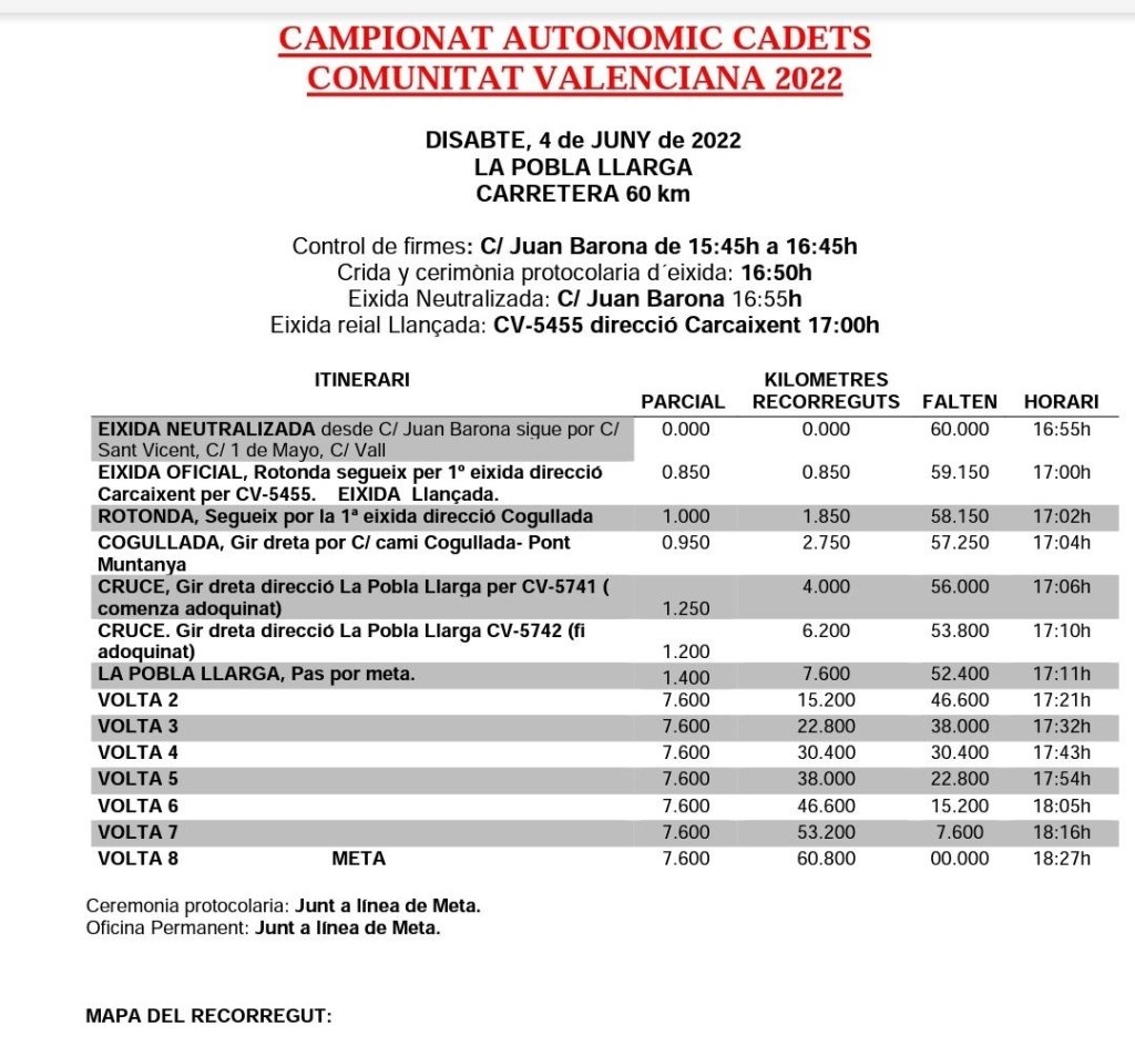 La Pobla Larga ha diseñado con verdadero esmero, para el sábado, día 4 de junio, el Campeonato Autonómico de la categoría cadete. La prueba dará comienzo a las 17 horas y las inscripciones ya están abiertas en la plataforma de la FCCV. El Club Ciclista Pobla Larga ha preparado un circuito muy atractivo que cuenta incluso con tramo pavimentado, entre Carcaixent y Forn de la Punta, de 1,3 kilómetros. El pelotón tendrá que dar 8 vueltas a ese trazado hasta completar los 60 kilómetros previstos, 10,4 de ellos de pavé. «Será un campeonato único, diferente y duro, sin duda», se asegura desde la organización, que ha elaborado unos trofeos muy originales para los ganadores. Al más puro estilo de la París-Roubaix entregará un adoquín.