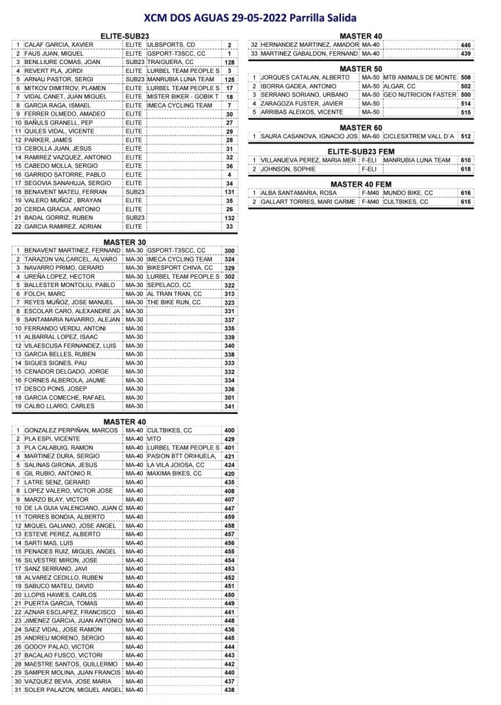 - Categorías: Sub23 Fem., Sub23, Master 60 Fem., Master 60, Master 50 Fem., Master 50, Master 40 Fem., Master 40, Master 30 Fem., Master 30, Elite Fem., Elite