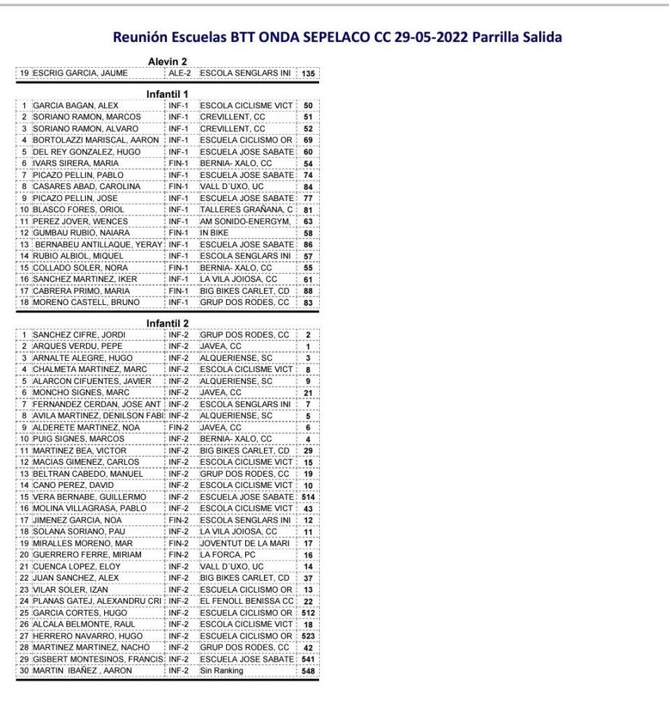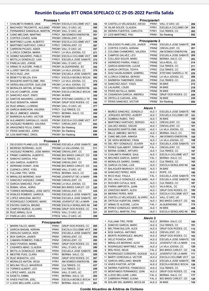 - Categorías: Promesas Masculino 2, Promesas Masculino 1, Promesas Femenino 2, Promesas Femenino 1, Principiantes Masculino 2, Principiantes Masculino 1, Principiantes Femenino 2, Principiantes Femenino 1, Infantil Masculino 2, Infantil Masculino 1, Infantil Femenino 2, Infantil Femenino 1, Alevin Masculino 2, Alevin Masculino 1, Alevin Femenino 2, Alevin Femenino 1