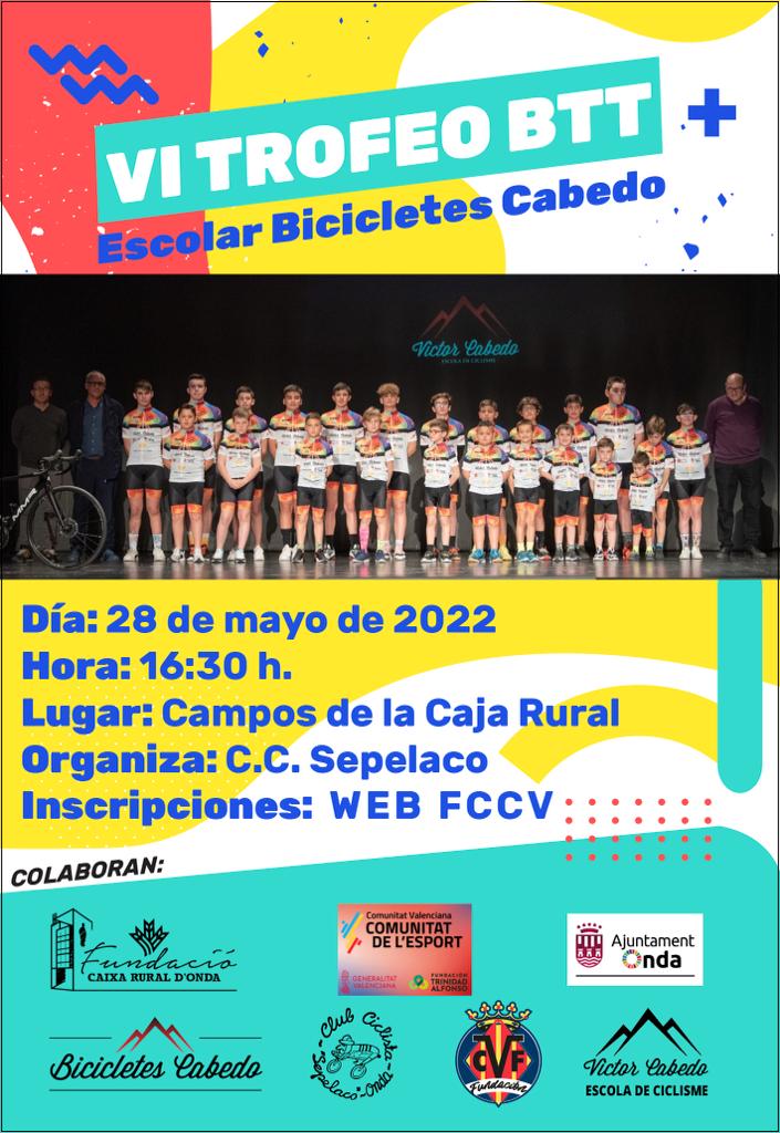 El sábado, día 29 de mayo, se disputa en Onda el VI Trofeo BTT Escolar Bicicletes Cabedo. Organizado por la FCCV la prueba se disputará a partir de las 16.30 horas en los denominados campos de la Caja Rural.