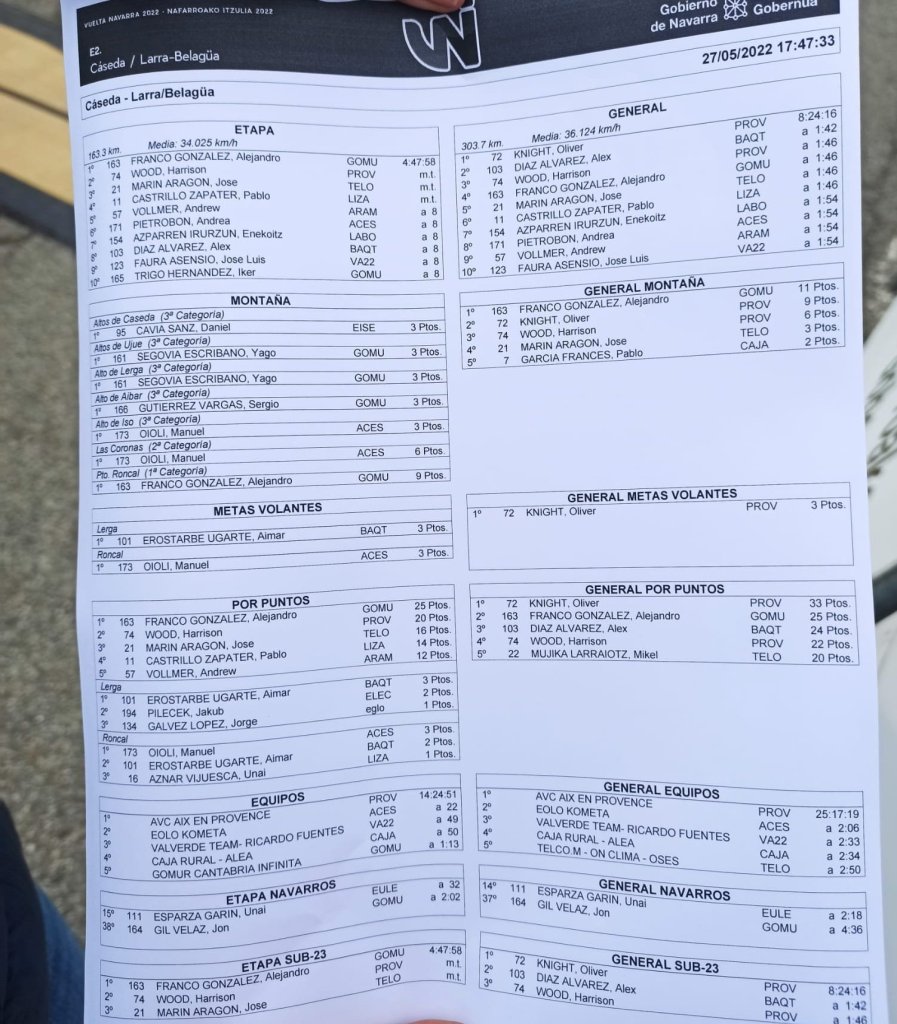 Alejandro Franco (Gomur) ha ganado la segunda etapa de la Vuelta a Navarra con salida en Cáseda y final en Larra/Belagua, tras 163,3 kilómetros de recorrido. El británico Oliver Knight (AVC Aix) sigue de líder.