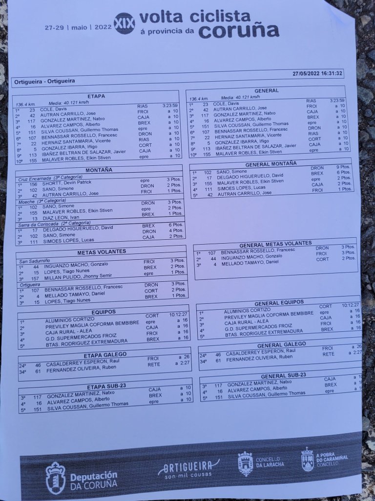 La XIX Volta Ciclista á Provincia da Coruña se ha iniciado hoy viernes en Ortigueira con una etapa de 136 kilómetros. El ganador ha sido Cole Davis (Rías Baixas), con un tiempo de 3:23:59. José Autran (Froiz) ha entrado a continuación, a 10 segundos, mientras que Natxo González (Filial Caja Rural) ha terminado tercero y primer sub 23.