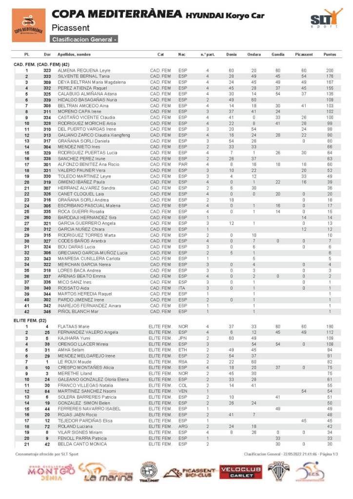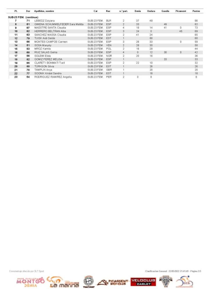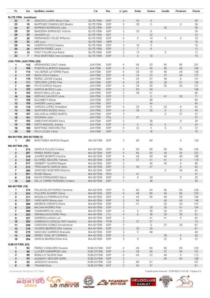 - Categorías: Sub23 Fem., Master 60 fem., Master 50 fem., Master 40 Fem., Master 30 fem., Junior fem., Elite fem., Cadete fem.