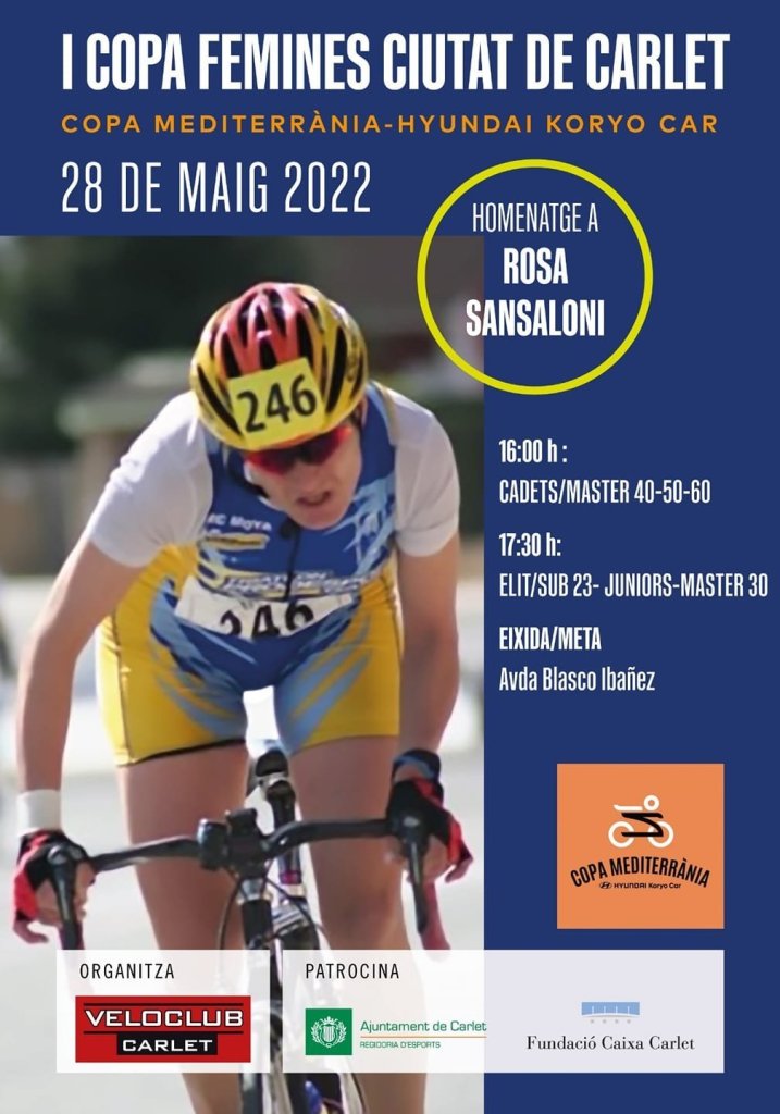 La ciclista vallera Rosa Sansaloni Vercher será homenajeada el sábado, día 28 de mayo, en la ciudad ribereña de Carlet con motivo de la quinta prueba ciclista de la Copa Mediterrània de Féminas para todas las categorías. A las 16 horas tomarán la salida las cadetes y las Máster 40, 50 y 60. Y a las 17.30, las élites, sub 23, júniors y Máster 30.