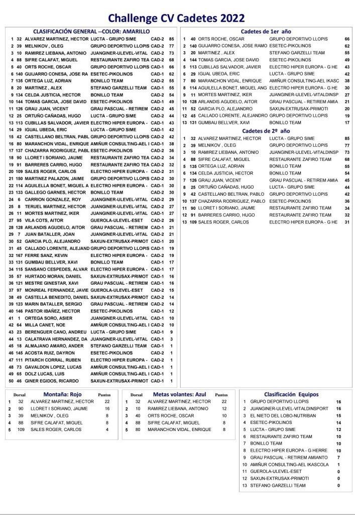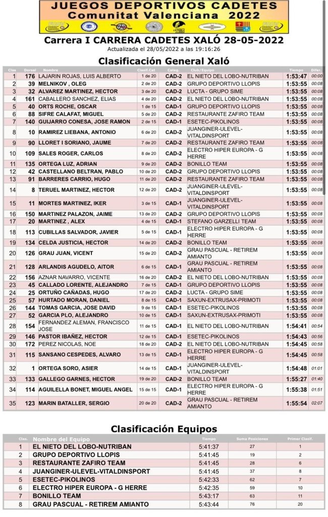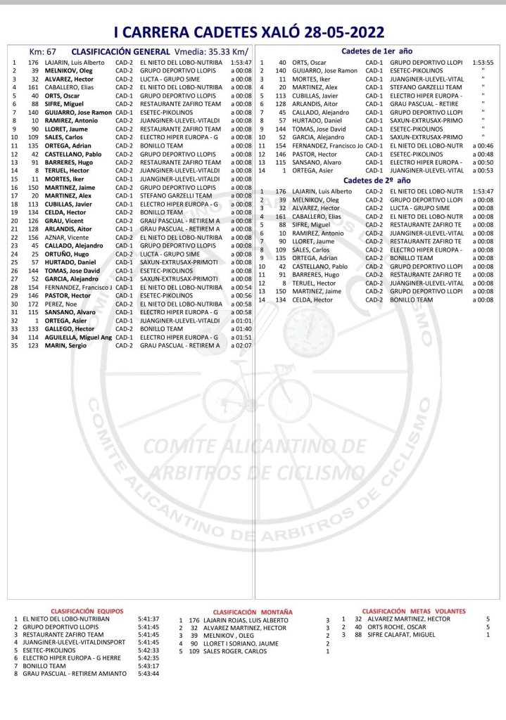 Luis Alberto Lajarín (El Nieto del Lobo) se ha impuesto hoy en solitario en el I Trofeu de Cadetes de Xalò que ha contado con 67,8 kilómetros de recorrido. Su tiempo en meta ha sido de 1:53:47. Oleg Melnikov (GD Llopis) ha dado tiempo al pelotón. Héctor Álvarez (Lucta Grupo Sime) ha completado el podio. Óscar Orts (GD Llopis) ha firmado un quinto puesto; Miquel Sifré (Zafiro) termina sexto; José Ramón Guijarro (Esetec Pikolinos), séptimo; y Jaume Lloret (Zafiro), noveno. El Nieto del Lobo ha sido el mejor equipo, por delante del GD Llopis y del Zafiro Team.