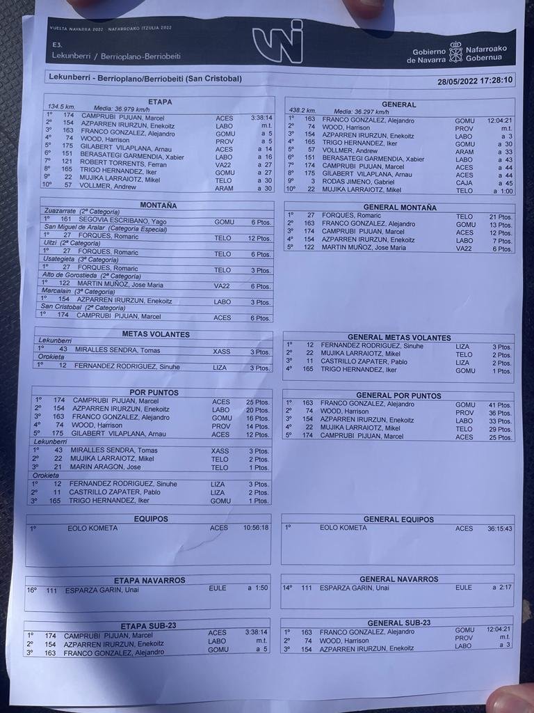 Miguel Camprubi (Fundación Contador) se ha impuesto en la tercera etapa de la Vuelta a Navarra con final en San Cristóbal tras 134,5 kilómetros de recorrido. Su tiempo ha sido de 3:38:14. Enekoiz Azparren (Laboral) ha sido segundo y Alejandro Franco (Gomur), tercero, lo que le ha valido para vestirse de líder. Romaric Forqués (Telcom) comanda el premio de la montaña; Sinuhé Fernández (Lizarte), las metas volantes; y Franco, la general por puntos.