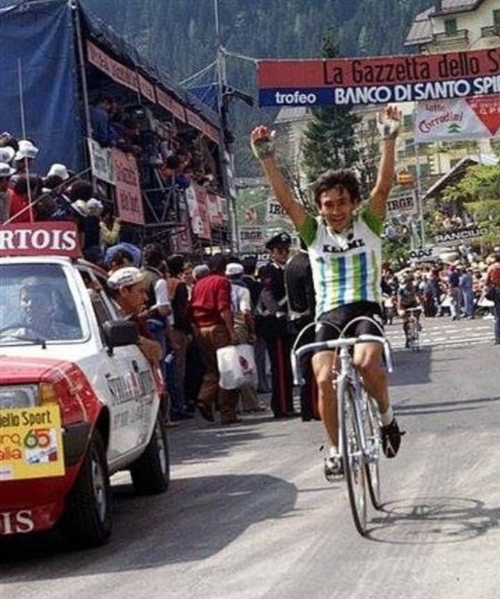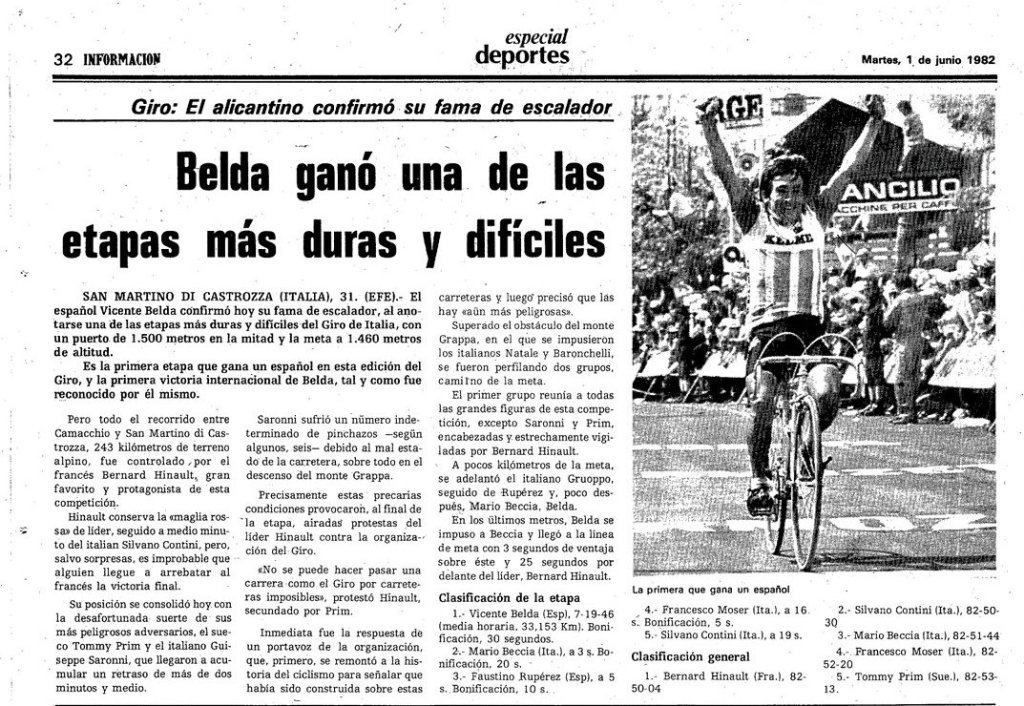 Hoy se cumplen 40 años del triunfo de Vicente Belda en una etapa de Giro de Italia, luciendo el maillot de Kelme, con final en San Martino di Castrozza y 243 kilómetros de recorrido. Era la decimosexta jornada, la más dura de aquella edición, con un puerto de 1.500 metros a mitad de jornada y meta a 1.460 metros de altitud. Superó por tres segundos a Mario Beccia y por cinco a Faustino Rupérez. Bernard Hinault, con la maglia rosa, entró a 25 segundos, que vio como sus directos rivales, Tommy Prim o Giuseppe Saronni se hundían. Belda se puso noveno en la general. Llegó a ser séptimo, pero un cólico nefrítico lo mando para casa y no pudo finalizar aquel Giro de 1982. Tuvo que poner pie a tierra en la penúltima etapa, con final en Pinerolo, ascendiendo el Col de Vars, el primer puerto de los cinco diseñados en aquella jornada.