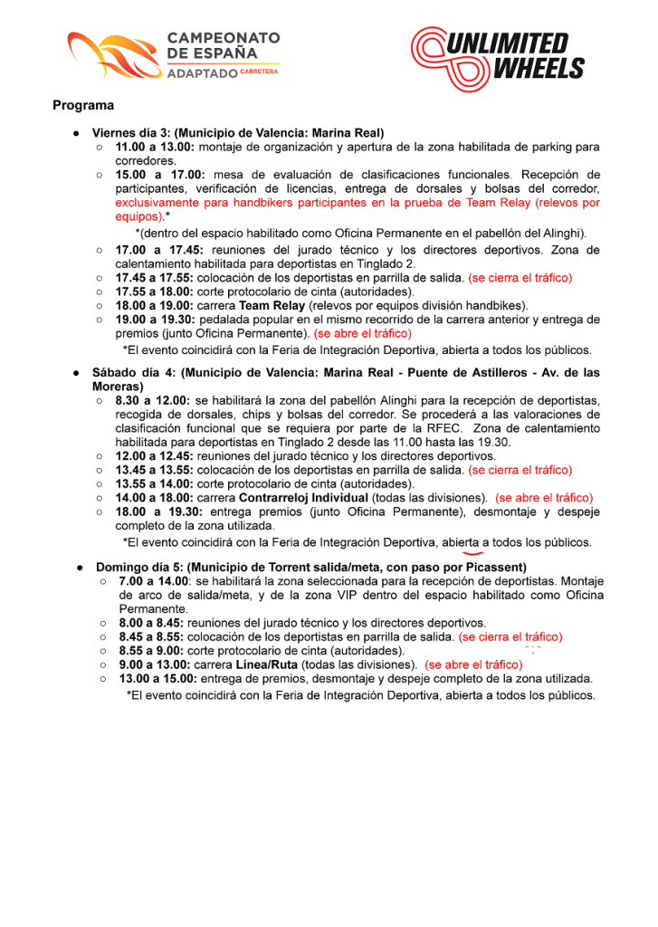El XIII Campeonato de España de Ciclismo Adaptado Ruta 2022 «G.P. de la Comunidad Valenciana» se celebrará este fin de semana, los días 3,4 y 5 de junio. La competición está abierta a todas las divisiones y clases de Ciclismo Adaptado, tanto masculino como femenino, y hay una previsión de participación de 150 ciclistas. Entre los participantes estará el actual líder de la Copa de España Carlos Sarrías. El corredor alicantino del CD Para-Sport Andalucía competirá tanto en la prueba contrarreloj como en la de ruta con el deseo de lograr el maillot rojigualdo. La que no estará en esta competición será su compañera de escuadra Inma Martínez. La también líder de Copa de España de Ciclismo Adaptado 2022, tras la prueba disputada en Cuevas de Almanzora, no cuenta con piloto. Una pena después del trabajo realizado. Confía en que vendrán tiempos mejores y podrá volver pronto a la competición. De momento, no puede defender el título de campeona de España que logró en 2021 en Cenicientos junto a Cris Pulido.