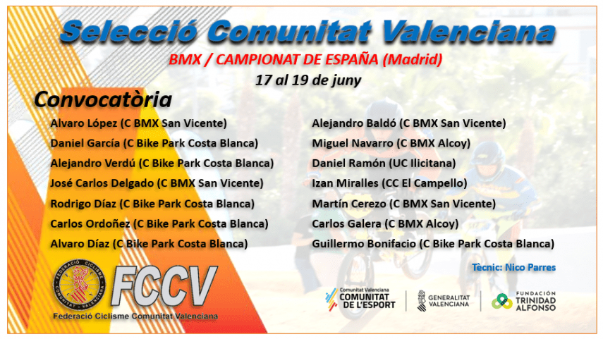 La Federación de Ciclismo de la Comunidad Valenciana (FCCV) ha convocado a 14 ciclistas para el Campeonato de España de BMX que se disputará en Arganzuela (Madrid) entre los días 17 y 19 de junio. El seleccionador autonómico Nico Parrés ha citado a los pilotos del Club BMX San Vicente Álvaro López, José Carlos Delgado, Alejandro Baldó y Martín Cerezo; a los del Bike Park Costa Blanca Daniel García, Alejandro Verdú, Rodrigo Díaz, Carlos Ordóñez, Álvaro Díaz y Guillermo Bonifacio; a los del Club BMX Alcoy Miguel Navarro y Carlos Galera; además de Daniel Ramón (Unión Ciclista Ilicitana) y a Izán Miralles (CC BMX El Campello). Alejandro Fuentes viajará como técnico, Daniel López será el mecánico y Rosa Fuster como presidenta de la comisión de BMX de la FCCV.